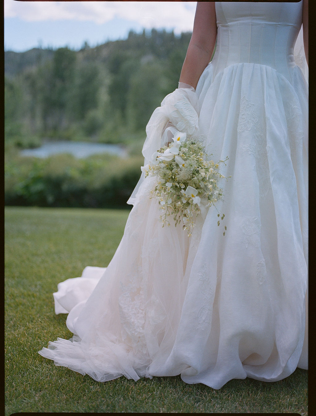 Annie worked with stylist Cynthia Cook Smith to curate her wardrobe with ONE OF for the welcome party catered by The Sun Valley Company. “The dress code was ‘Mountain Cocktail,’ so I accessorized with a western purse from Gabriella Hearst and light blue heels from Black Suede Studio for a splash of something blue,” Annie recalls. For the ceremony and reception, she donned a Danielle Frankel dress. She adds, “The fabric felt perfect for Idaho and every part of the dress just felt like me.” Britt Davis applied her beautiful makeup. Patsy Howser with Escape Salon and Danielle Anspach styled her hair.