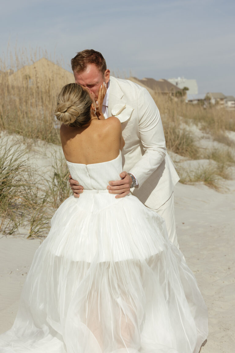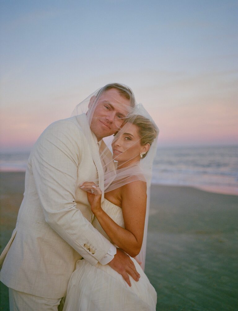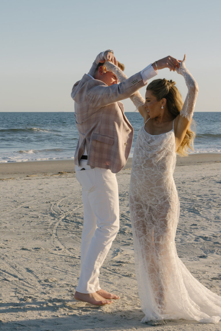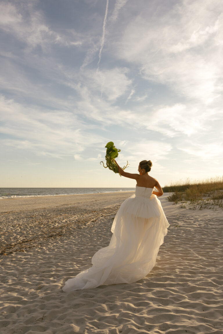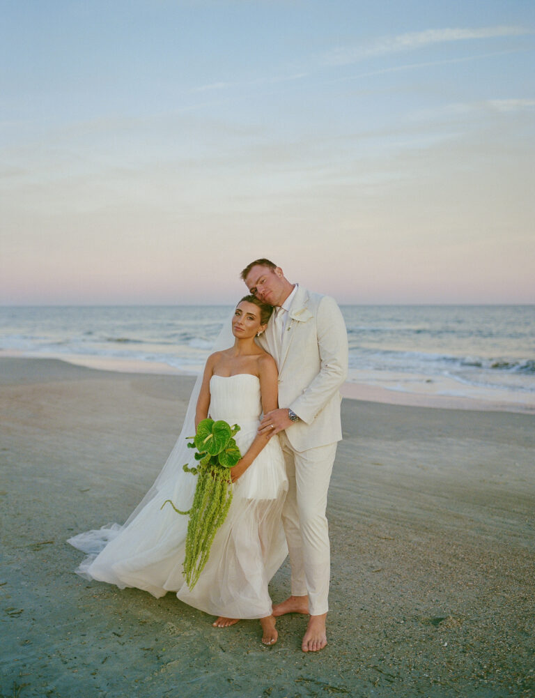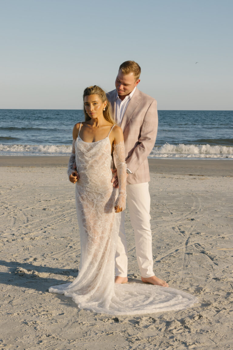 When planning the wedding, the couple chose Hilton Head, South Carolina, a place Lauren visited every year with her grandparents. “Choosing Hilton Head meant Matt could get married on the beach,” a setting he had always imagined, “and I could walk down with my grandpa’s spirit beside me on the same beach we walked together my whole life,” she shares. Her grandfather’s pin was affixed to her bouquet, and she walked herself down the aisle.