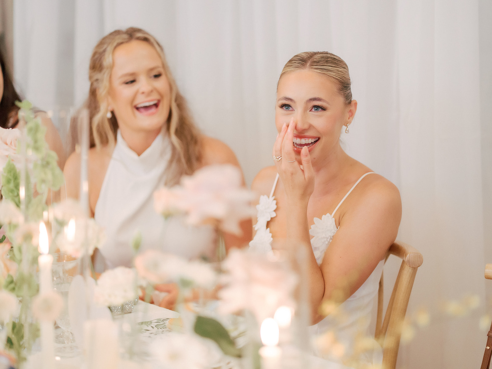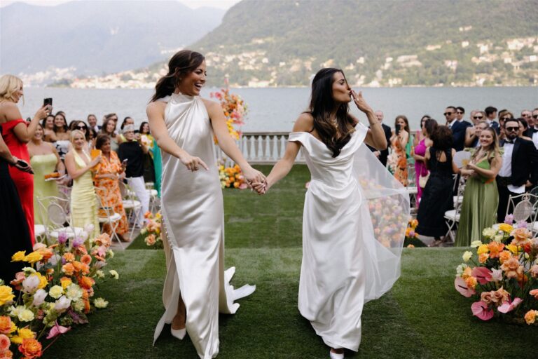 For the ceremony, Kylee wore a Poppy Mae dress from I Do Bridal, paired with pearls that Sophie gifted her on the morning-of. Later on, she also changed into an Amanda Uprichard halter-neck style. “We kept the dresses separate from each other but had a few key people like our sister, sister-in-law, and maid of honor to ensure the dresses flowed and complemented each other,” Kylee explains. They both got glammed up with Ivonne Mendoza.