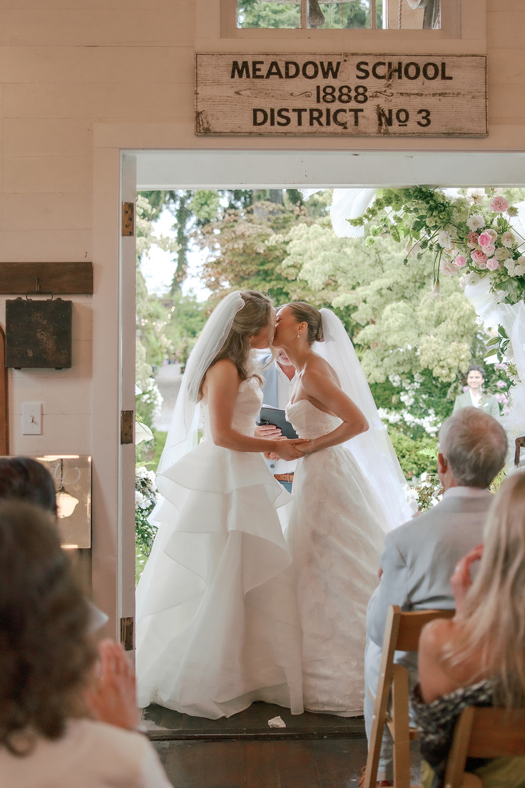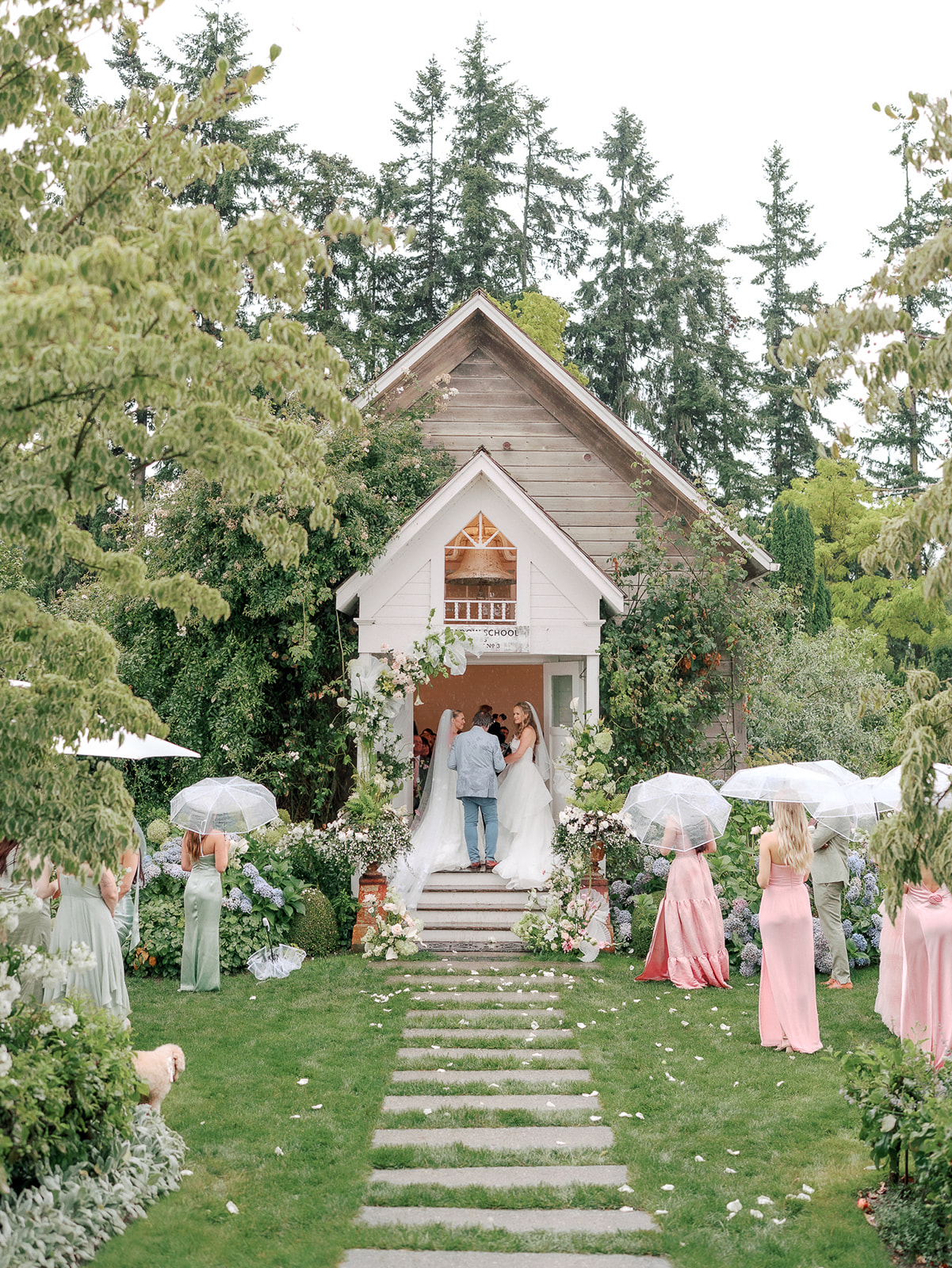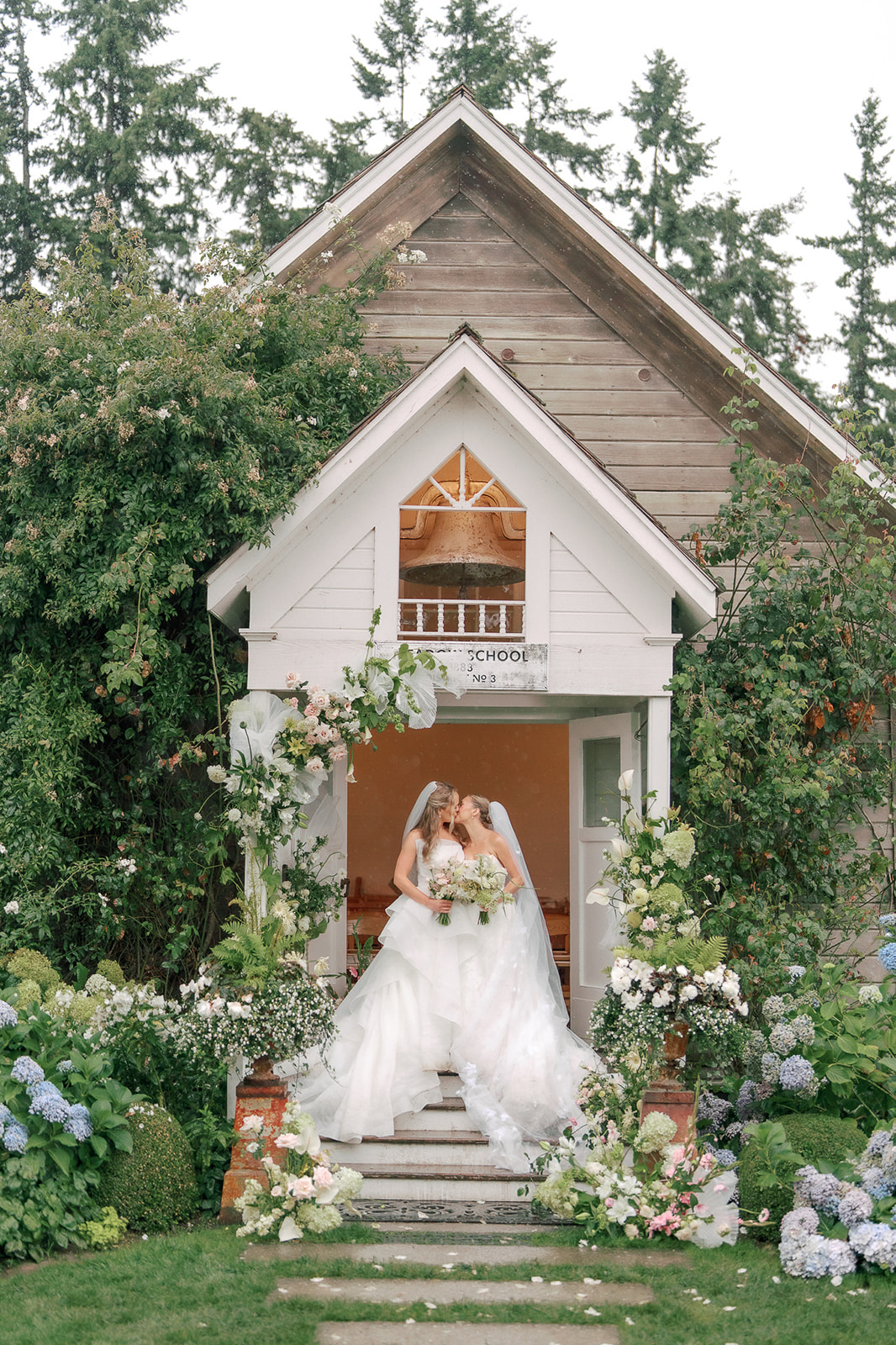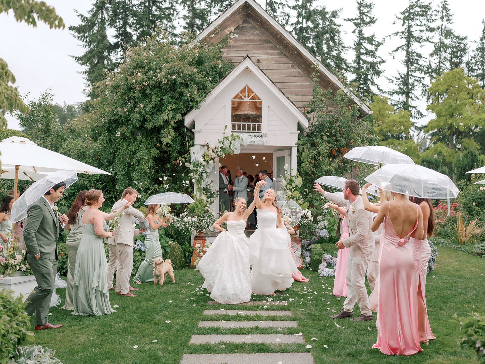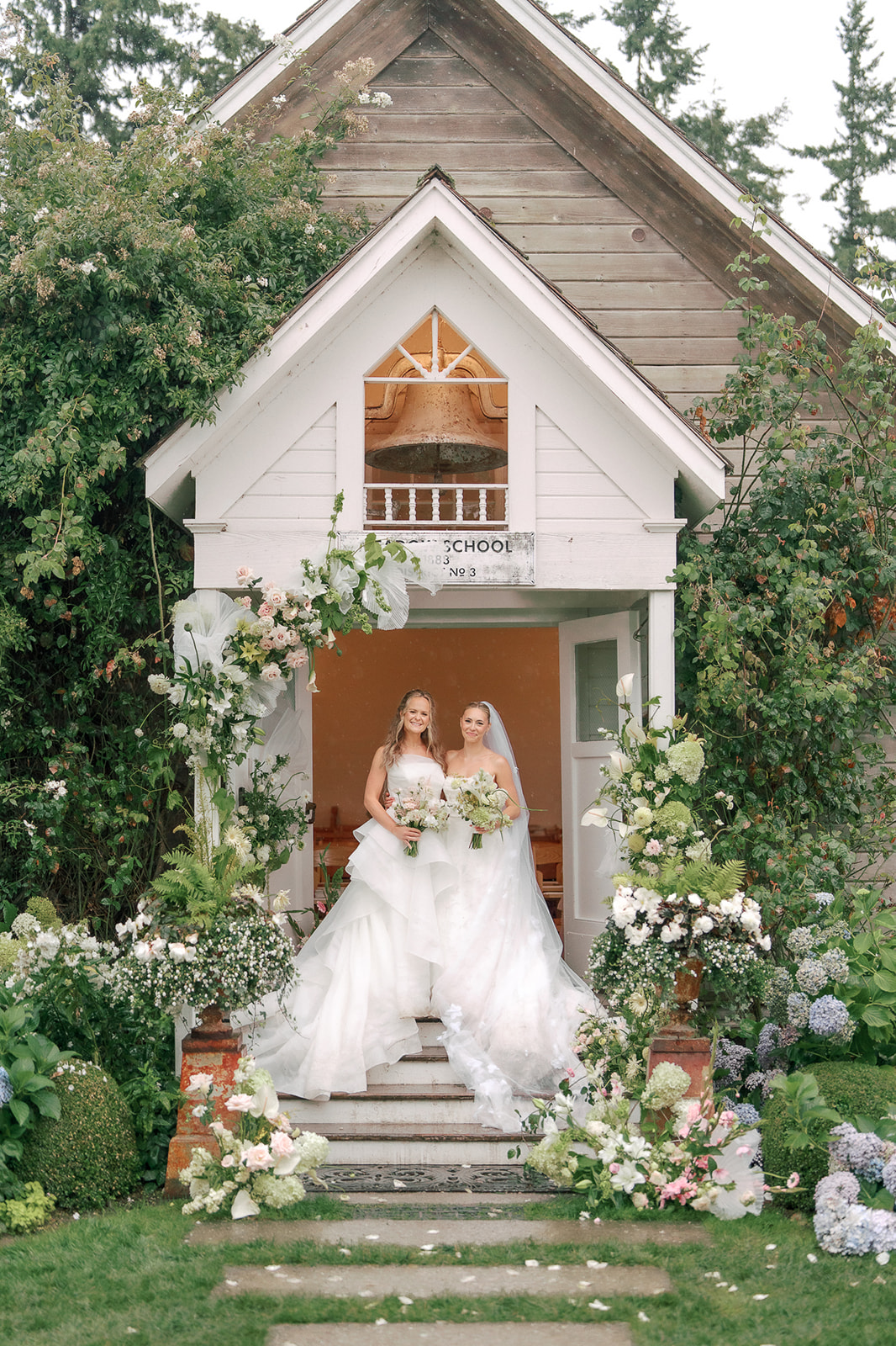 As the brides-to-be both come from a long line of green thumbs, they agreed they wanted their wedding to feel like a secret fairytale garden. “Our families also both have long lines of teachers, and having our ceremony at the historic schoolhouse felt like a lovely nod to them,” Sophie explains. “Christianson Nursery offered lush rose gardens and multiple beautiful spaces that we could host the various stages of our wedding day. I wanted to embrace my British heritage and lean into the Pride and Prejudice moody romance of the English rose gardens.”