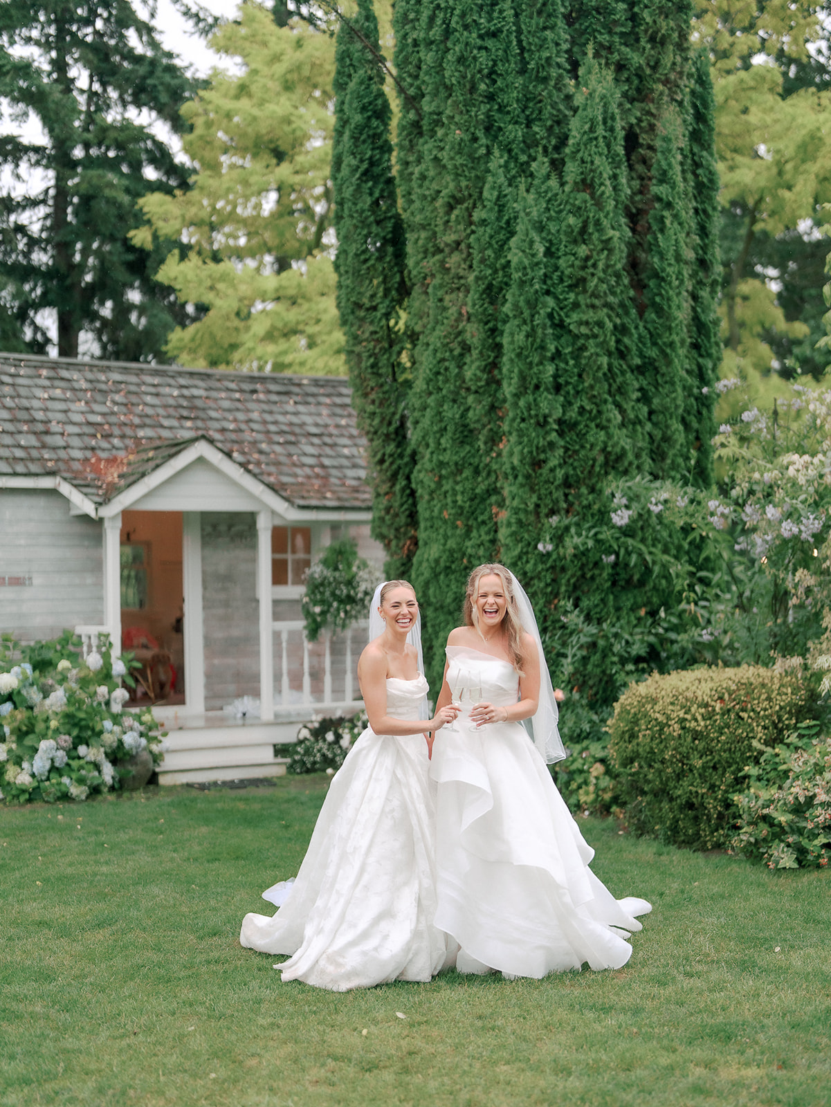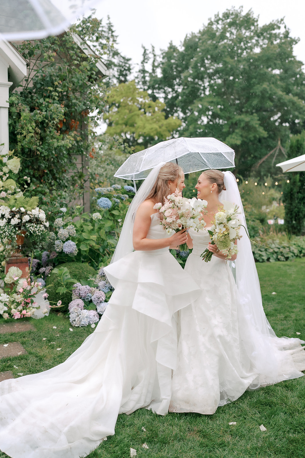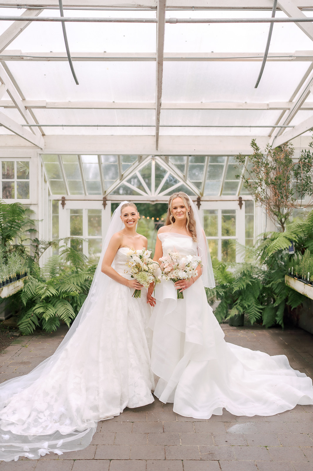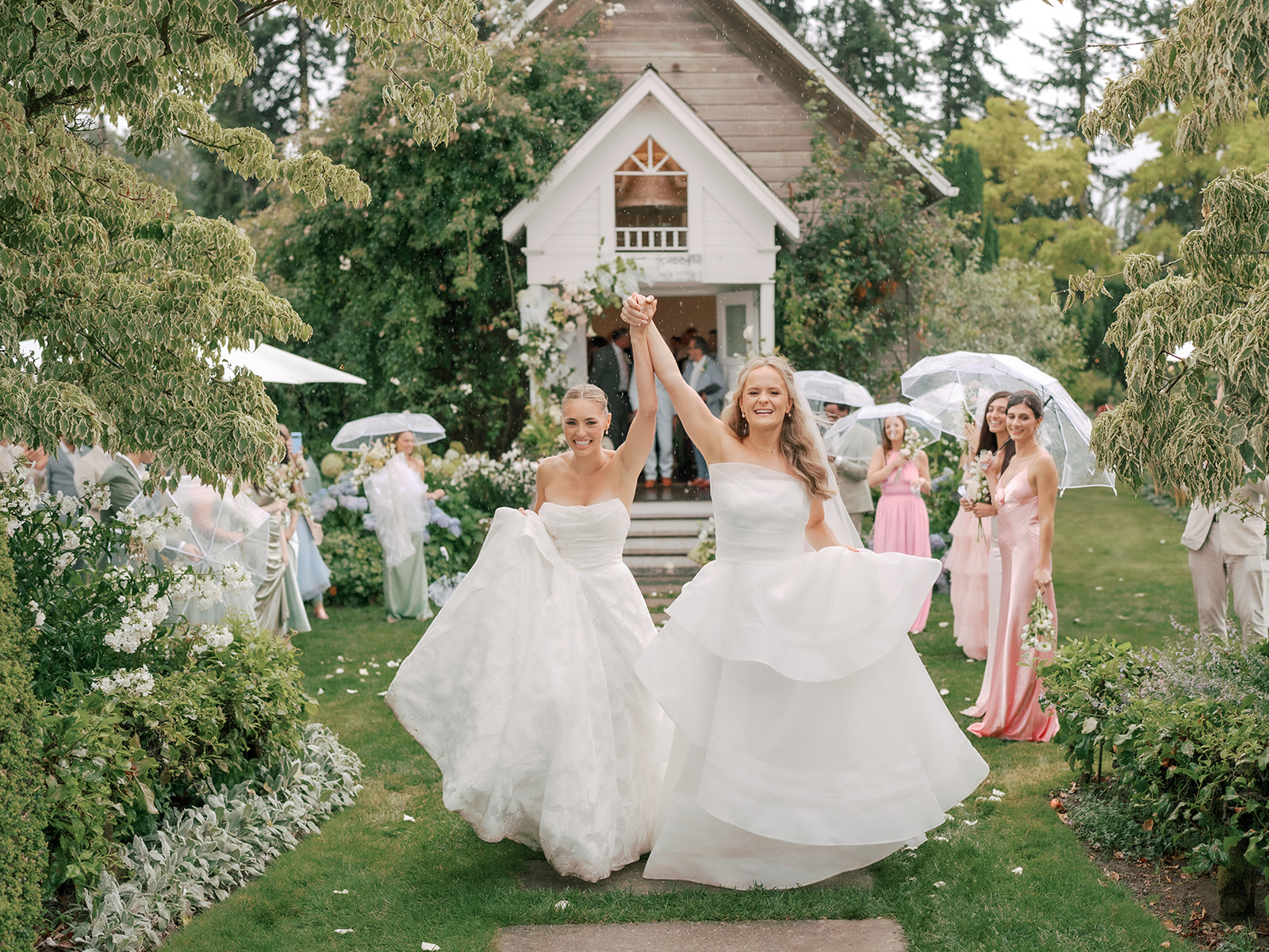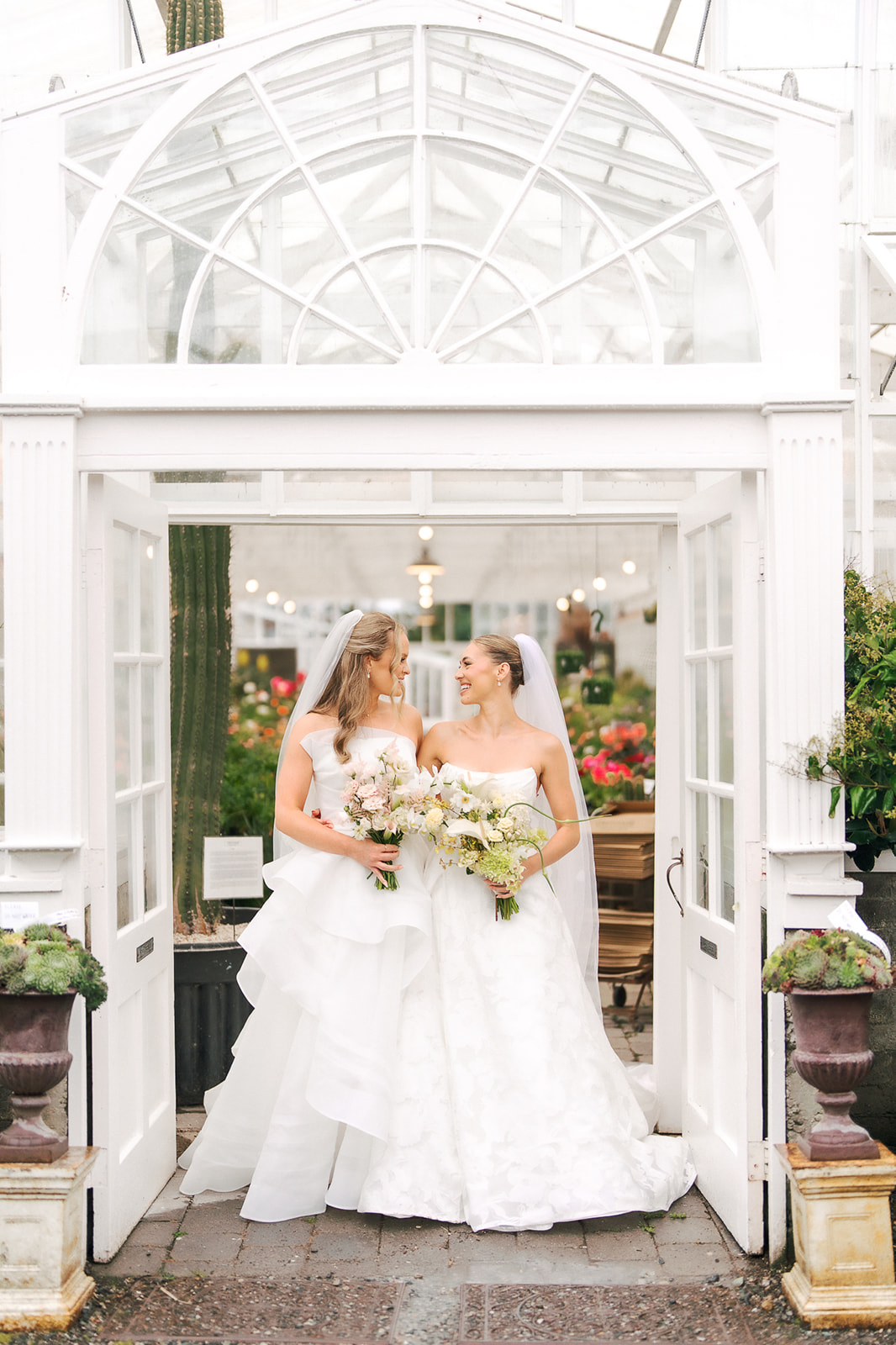 As the brides-to-be both come from a long line of green thumbs, they agreed they wanted their wedding to feel like a secret fairytale garden. “Our families also both have long lines of teachers, and having our ceremony at the historic schoolhouse felt like a lovely nod to them,” Sophie explains. “Christianson Nursery offered lush rose gardens and multiple beautiful spaces that we could host the various stages of our wedding day. I wanted to embrace my British heritage and lean into the Pride and Prejudice moody romance of the English rose gardens.”
