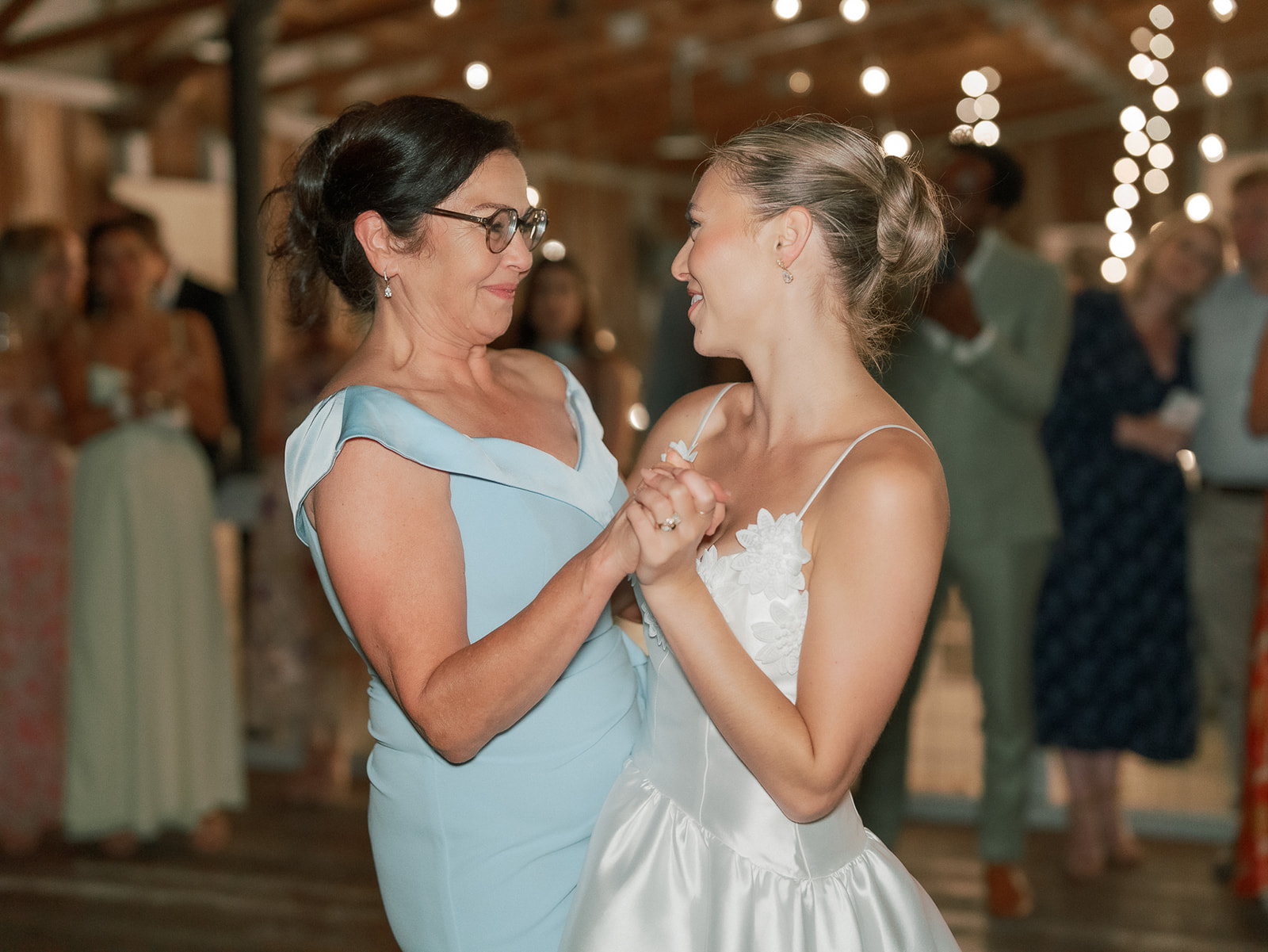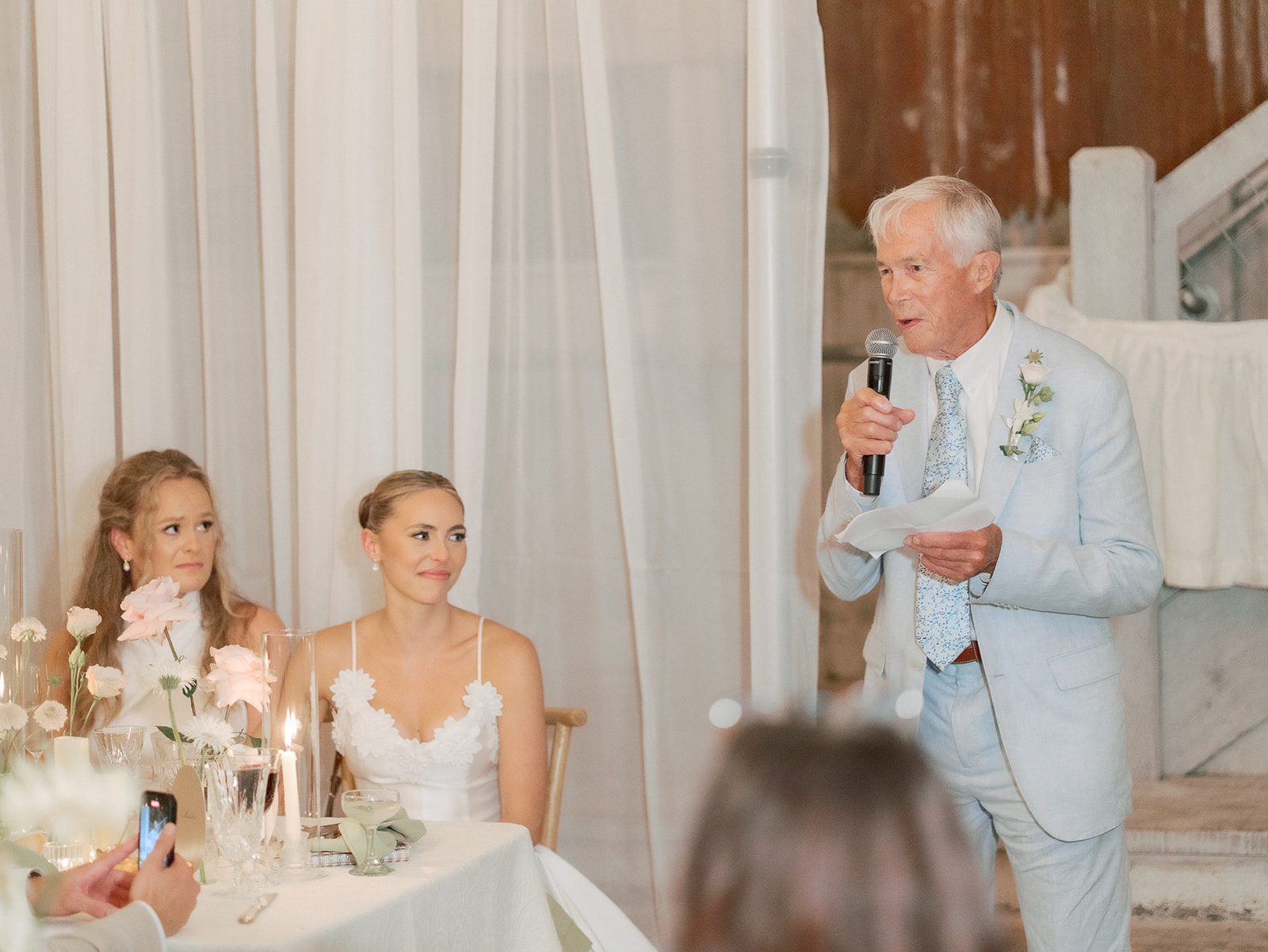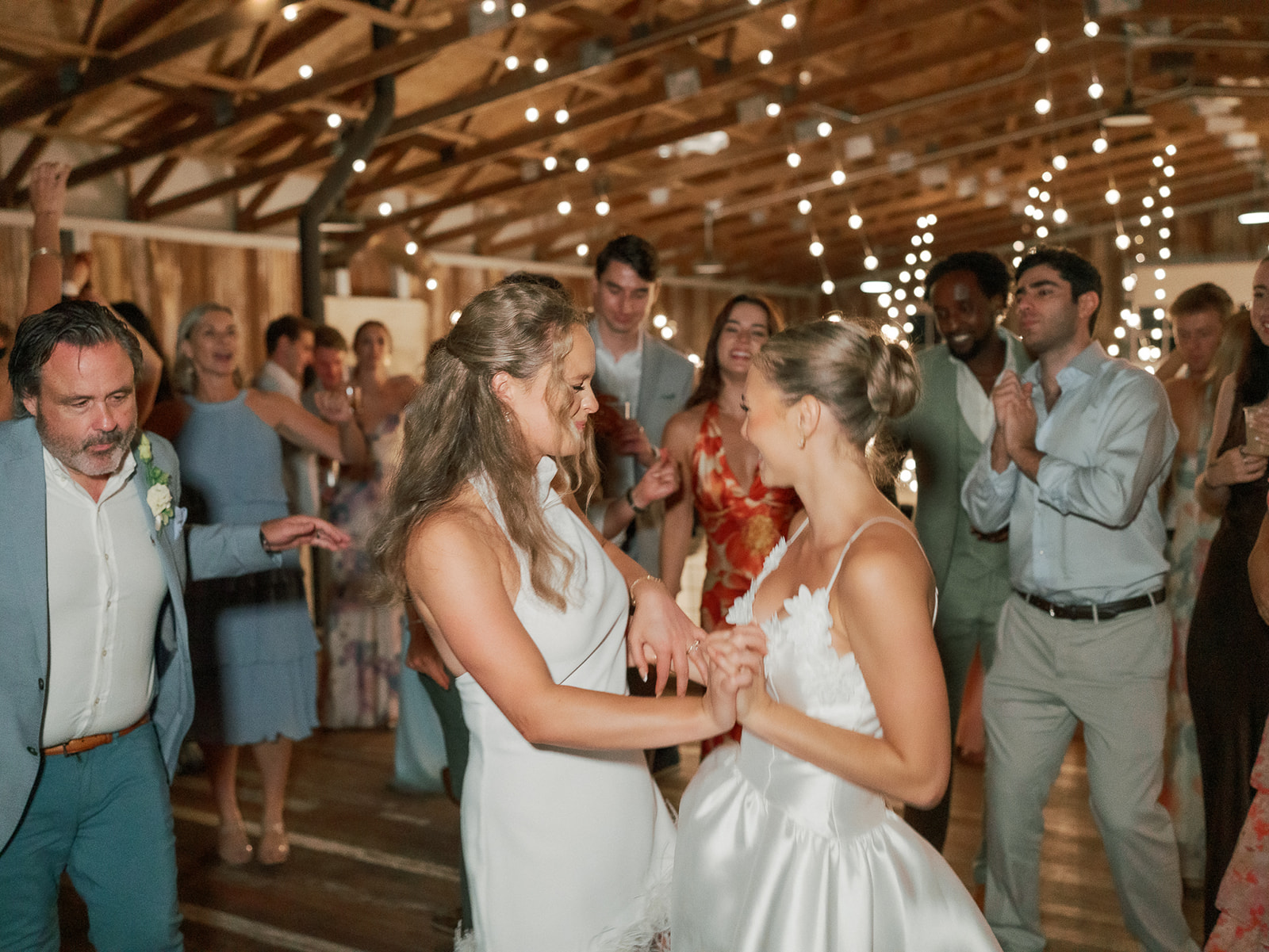 On August 15, 2025, cozy rain caused the outdoor ceremony to pivot. Everyone was moved inside the schoolhouse, except for the wedding party. Photographer Olga Andreyanova captured Sophie’s walk down the aisle with her grandfather first, followed by Kylee with her father, as “Halo” played. The brides stood in the doorframe, decorated with florals by Cole Buys Design. “Kylee spoke not only to me, but directly to my dad in heaven, asking for his blessing,” Sophie says of the exchanging of the vows. “It was a moment of profound beauty and grace, a powerful connection that tied our love story to the past and future.”